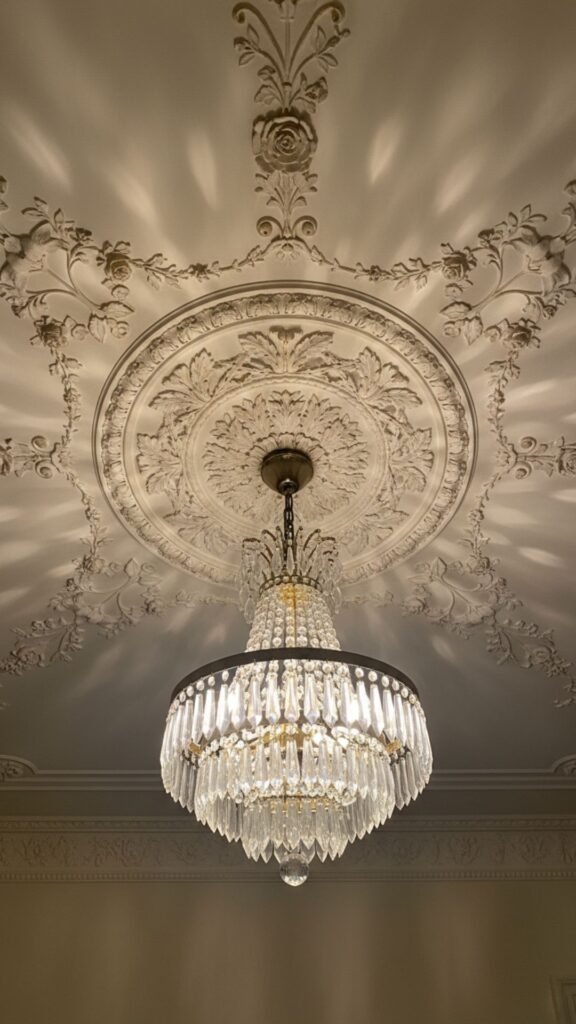 If a full ceiling overhaul isn’t in the budget, focus on the center. A large, ornate ceiling medallion draws the eye upward and anchors a vintage chandelier perfectly.