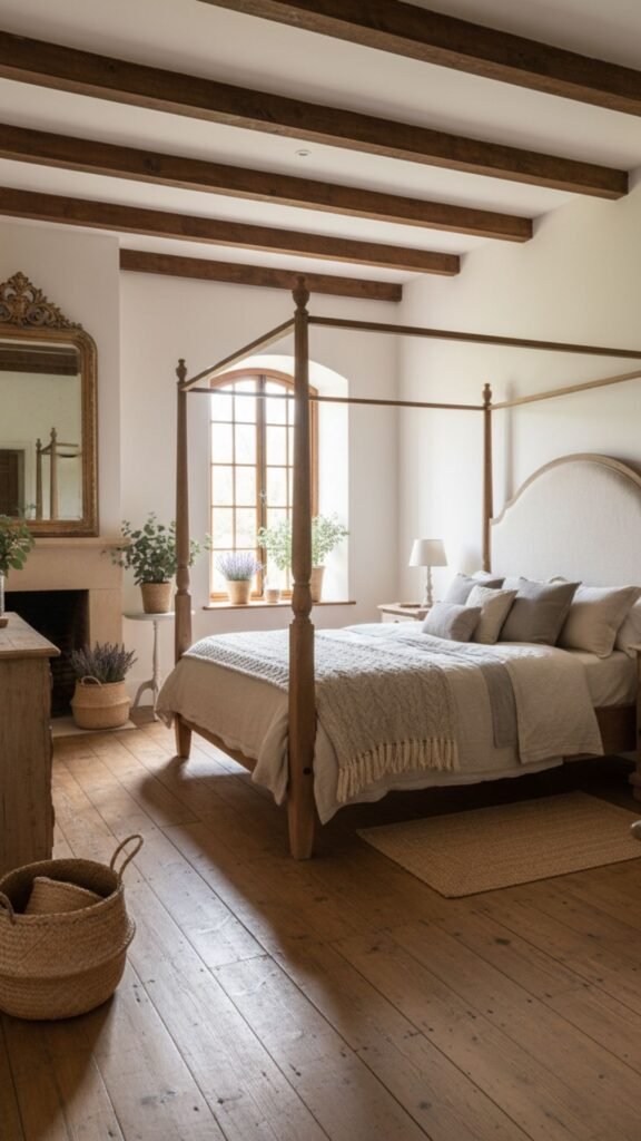 Exposed beams offer a warm, farmhouse aesthetic. They work exceptionally well in bedrooms with high ceilings, making the space feel cozier and more grounded.
