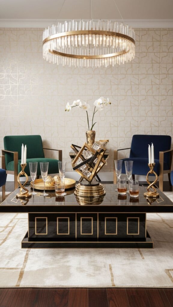 Geometric inlays, mirrored accents, and high-gloss finishes make the Art Deco hutch a glamorous centerpiece for a bold living room.