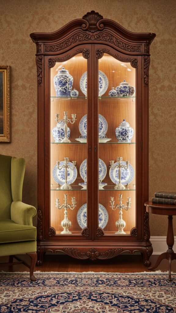 - Source a dark-stained mahogany or walnut piece with glass-front cabinets