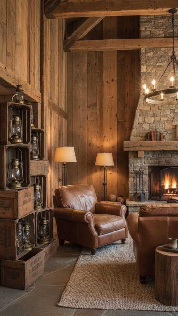 - Stack vintage crates, lanterns, and cast iron accents on shelves