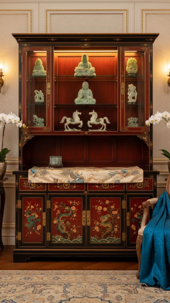 - Display jade figurines, blue-and-white porcelain, and silk accents