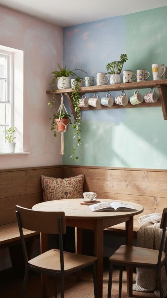 - Fill shelves with mismatched vintage mugs, pitchers, and small plants