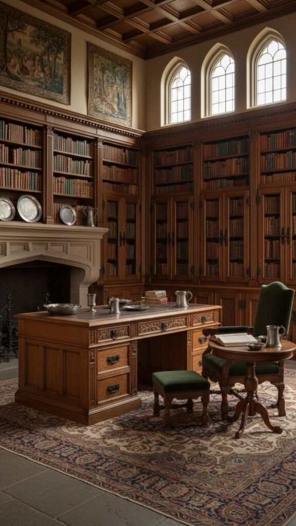 - Display pewter vessels, leather-bound books, and tartan accessories