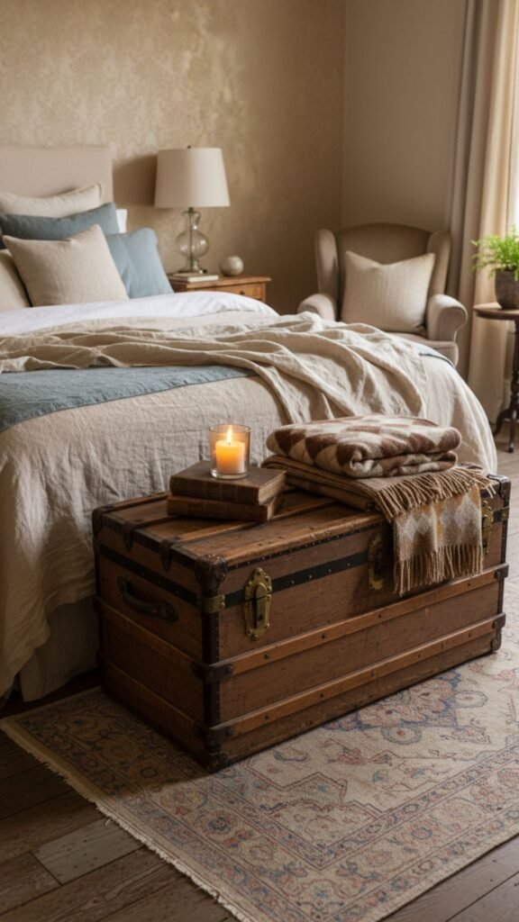 A vintage trunk at the foot of your bed or tucked in a corner provides both storage and visual interest. These pieces tell a story and add authentic character to your space.