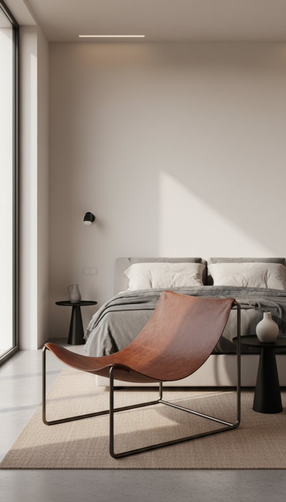 If you prefer an uncluttered, airy vibe, a leather sling chair is a superb choice. It exudes masculinity and sophistication while taking up less visual weight than a traditional armchair.