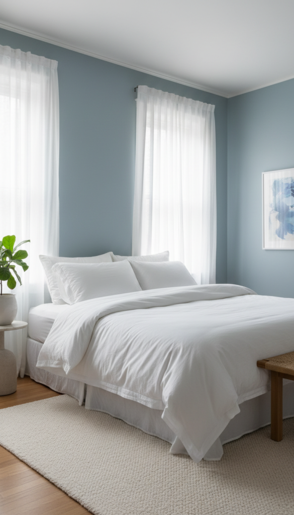 This is the gold standard for relaxation. Blue is psychologically proven to be the most calming color for the human brain, evoking images of the ocean and the sky. When paired with a sharp, clean white, it creates an airy, cloud-like atmosphere that feels open and breathable.