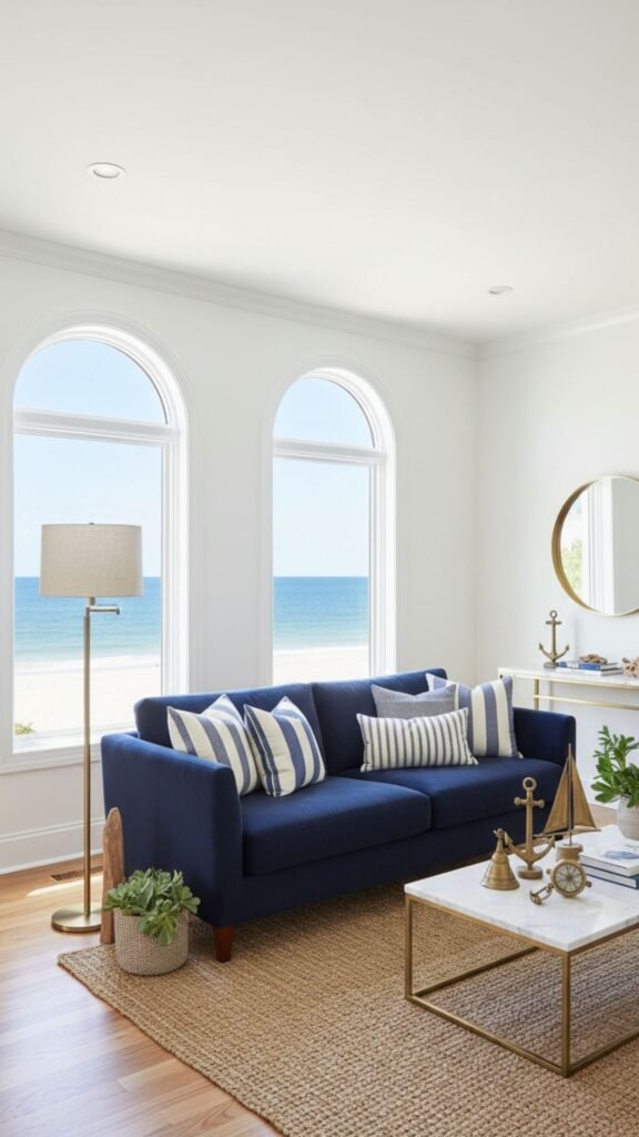 Crisp navy blue paired with bright white creates a timeless maritime feel. This high-contrast color palette brings a sophisticated yet preppy energy to your living room. It works beautifully in spaces with plenty of natural light.
