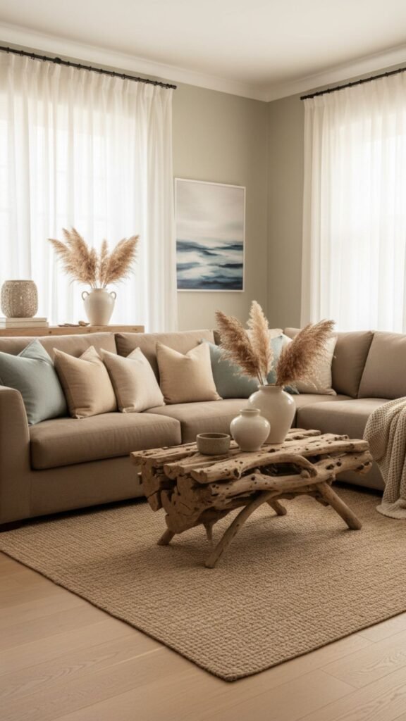 • Incorporate a reclaimed driftwood coffee table as the room’s focal point.