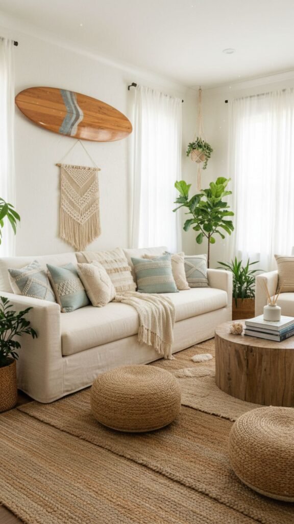 Eclectic patterns and natural textures offer a laid-back, surf-inspired retreat. This style embraces a perfectly imperfect aesthetic. It mixes vintage finds with relaxed, comfortable furnishings.