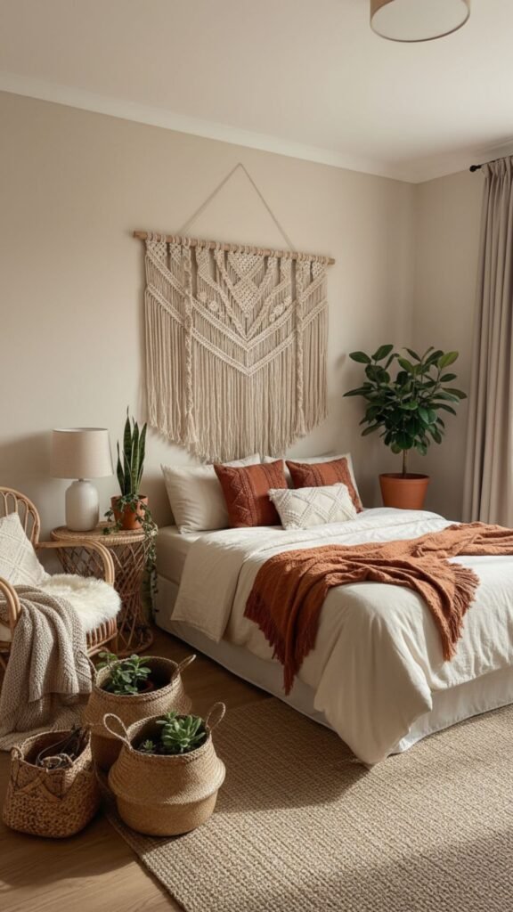 This look embraces warm beige, terracotta, and cream tones, paired with handwoven macramé wall hangings and plant hangers. The result is a grounded, tranquil space that feels connected to nature.