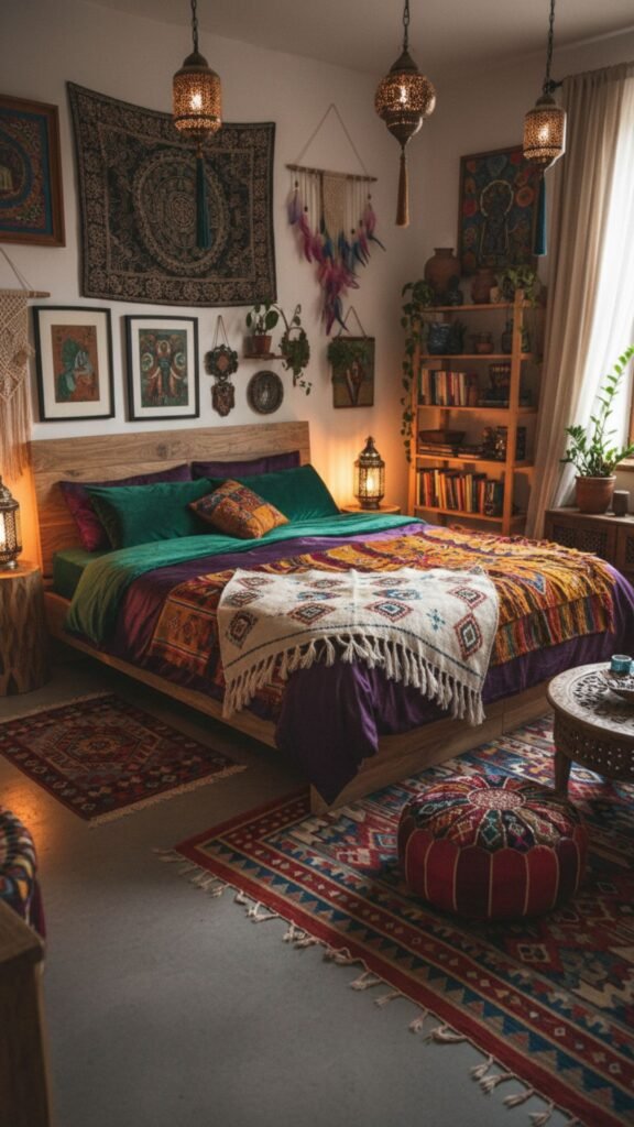 Infuse your bedroom with rich colors like emerald green, deep purple, and burnt orange. Layer patterned textiles from different cultures—Moroccan rugs, Indian block-print bedding, and Turkish throws—to create a globally-inspired retreat.