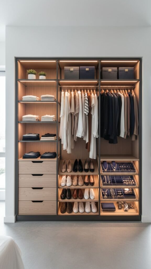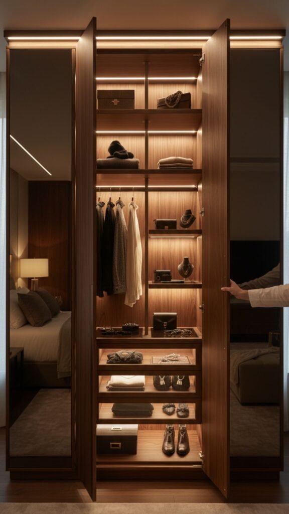 Illuminate your wardrobe interior with integrated LED strips. This trend combines functionality with ambiance, making it easier to find your clothes while adding a touch of luxury to your bedroom.