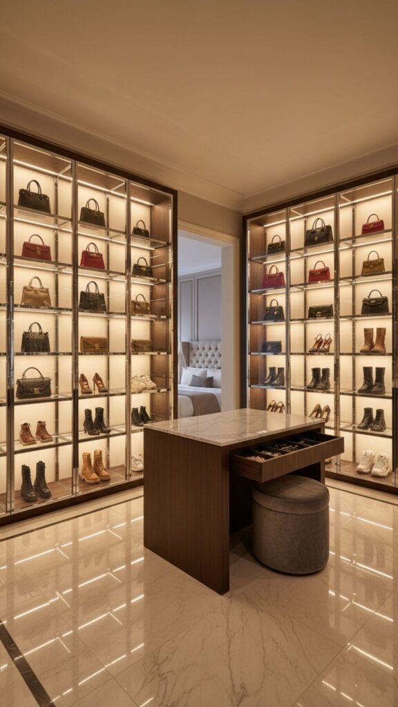Show off your favorite clothing pieces and accessories with wardrobes featuring glass doors or open display sections. This trend works beautifully in walk-in closets and master bedrooms.