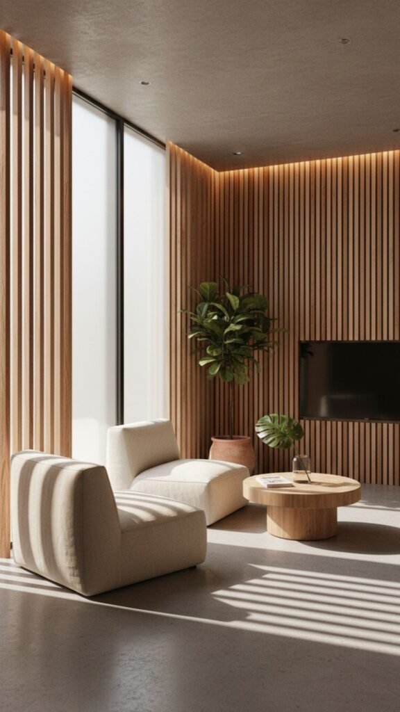 Slat paneling gives living rooms a contemporary, almost spa-like quality. The narrow vertical strips create rhythm and shadow, adding visual interest without clutter.