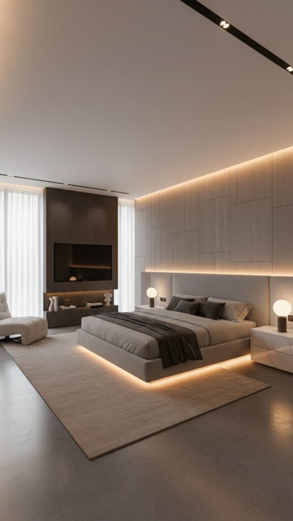 Clean-lined LED ceiling fixtures offer a contemporary take on luxury lighting. These sleek designs provide excellent illumination while maintaining the minimalist aesthetic popular in modern bedroom design.