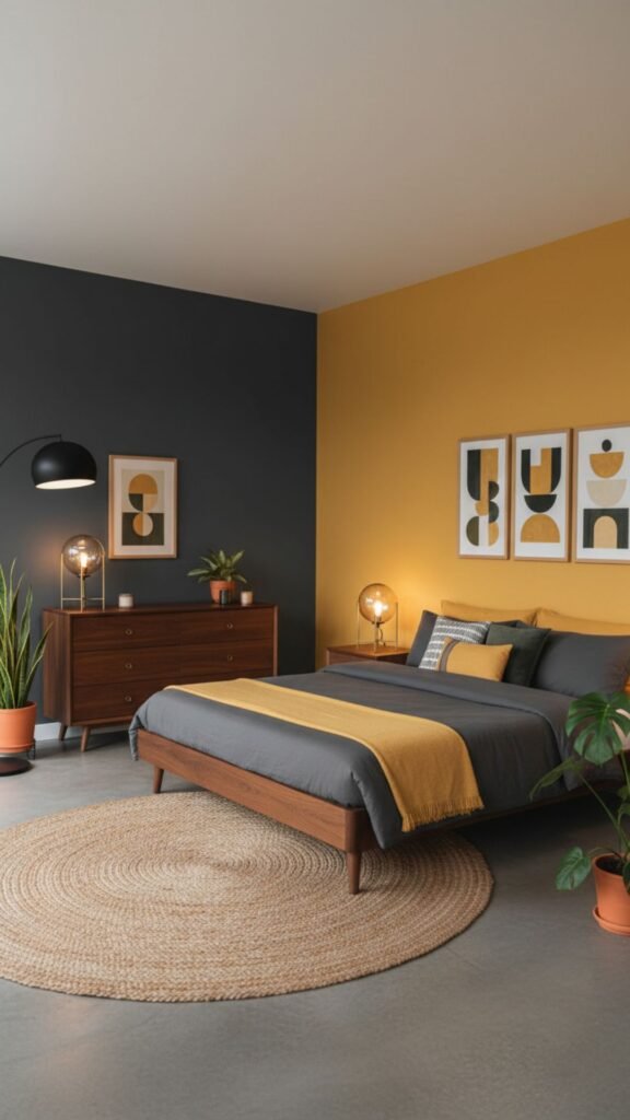 For a mid-century modern aesthetic, this bold contrast delivers instant character. Mustard yellow injects vibrant energy, while charcoal grey anchors the room with deep, moody sophistication.