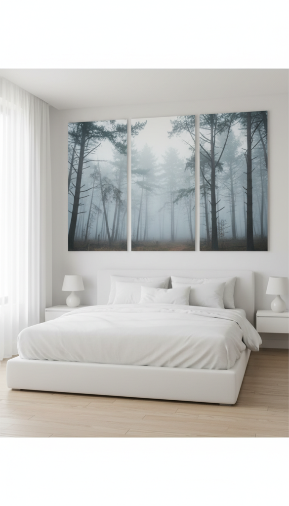 A triptych splits a single image or theme across three separate panels. This technique tricks the eye into seeing the room as wider and more structured. It brings a sense of rhythm and order that is essential for a high-end aesthetic.