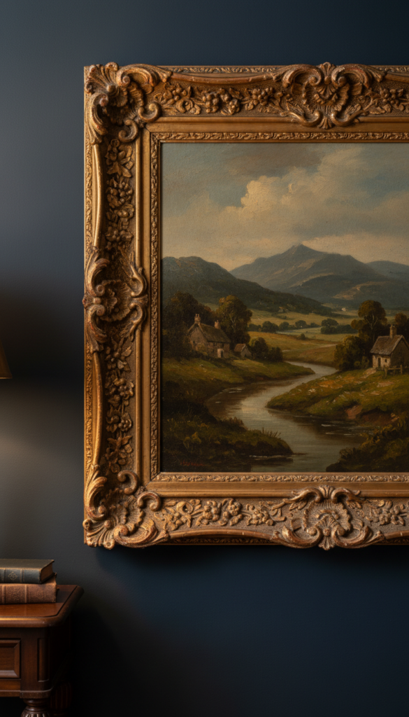 The “old money” aesthetic relies heavily on pieces that look inherited. A vintage (or vintage-style) oil painting adds soul and history to a bedroom. Small landscapes or portraits in heavy frames provide a rich contrast to modern bedding.