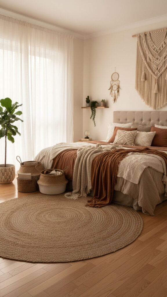 Bring warmth and dimension to your boho bedroom by layering various textiles. Think macramé wall hangings, woven baskets, and soft cotton throws that add depth without overwhelming the space.