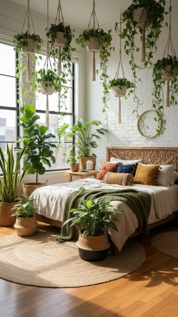 There’s no set number, but boho bedrooms typically feature multiple plants of varying sizes. Start with 3-5 plants and add more as you get comfortable with plant care. Just ensure you have adequate natural light and don’t overcrowd the space to the point where it feels cluttered.
