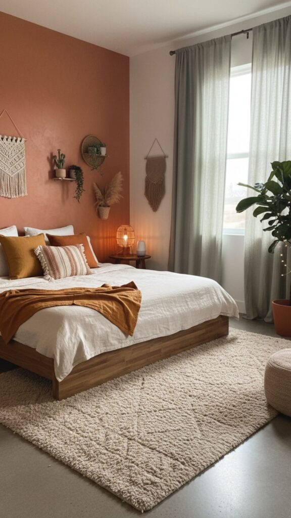 Boho bedrooms thrive on warm, earthy tones that create a cozy, inviting atmosphere. Think terracotta, mustard yellow, burnt orange, and sage green.