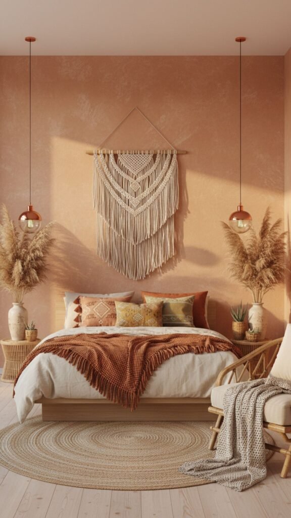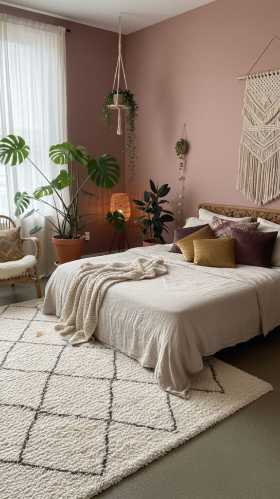 Dusty rose offers a romantic, soft touch that elevates the traditional bohemian palette. This muted pink shade feels sophisticated and warm, providing a calming environment ideal for rest. It creates a subtle glow that flatters both natural and artificial light.
