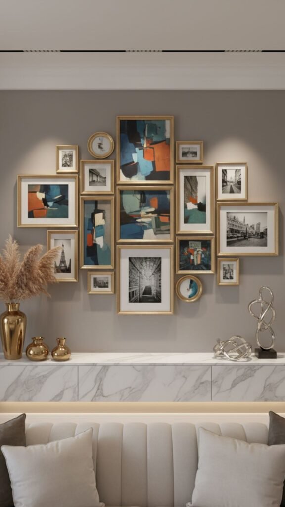 Incorporating various metallic finishes adds a touch of glamour and depth to your walls. Combining gold, silver, and brass frames catches the light beautifully and adds a subtle luxury to the room. This approach feels curated and collected over time, rather than bought all at once.
