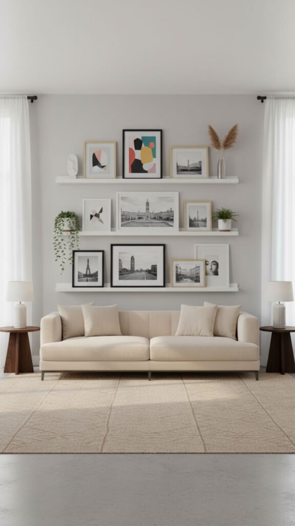 Using picture ledges offers flexibility, allowing you to swap out artwork whenever the mood strikes without making new holes in the wall. This layered approach feels casual yet intentionally styled. It brings a modern, studio-like vibe to the living room.