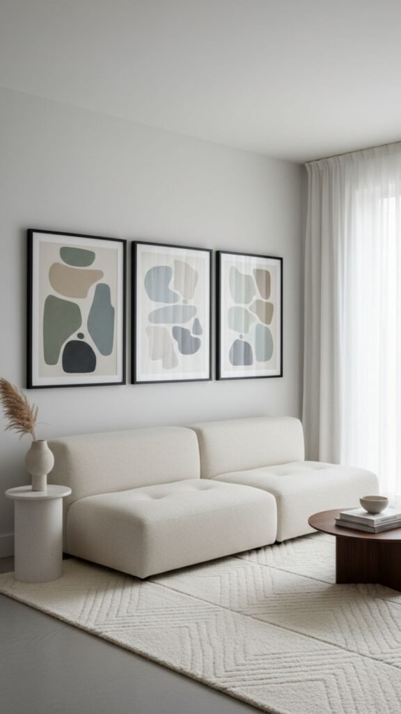 Sometimes, less is incredibly impactful. A minimalist trio uses three large, evenly spaced frames to make a bold statement. This streamlined approach fills a large wall horizontally, typically above a sofa, providing a serene and uncluttered aesthetic.