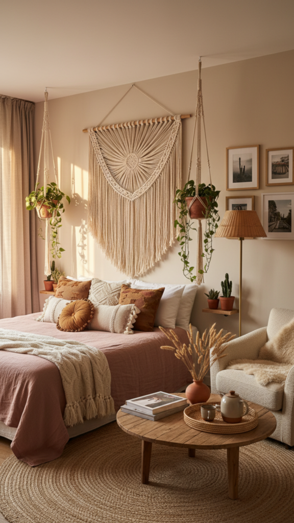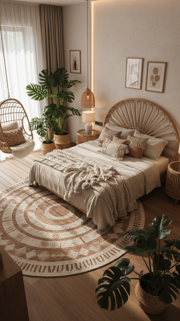 Boho bedrooms blend eclectic patterns, natural materials, layered textiles, and globally-inspired décor. The style emphasizes comfort, personal expression, and a relaxed atmosphere with earthy tones and handcrafted elements.