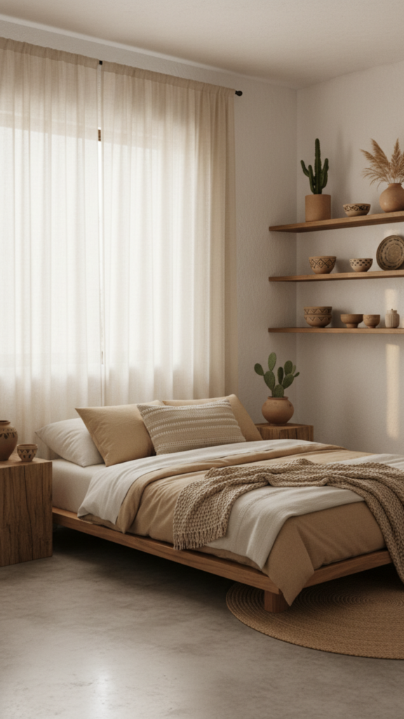 Inspired by desert hotels and Southwestern retreats, this look pairs minimalism with bohemian warmth. The result is calming, uncluttered, and filled with natural materials.