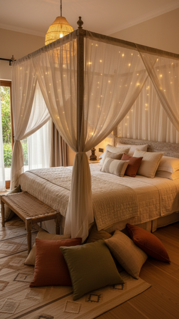 Few things feel more luxurious than a canopy bed draped in flowing fabrics. This boho hotel look creates an intimate, cocoon-like sleeping space that feels like a private sanctuary.