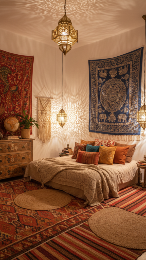 • Incorporate globally-inspired décor like Moroccan lanterns or Indian tapestries
