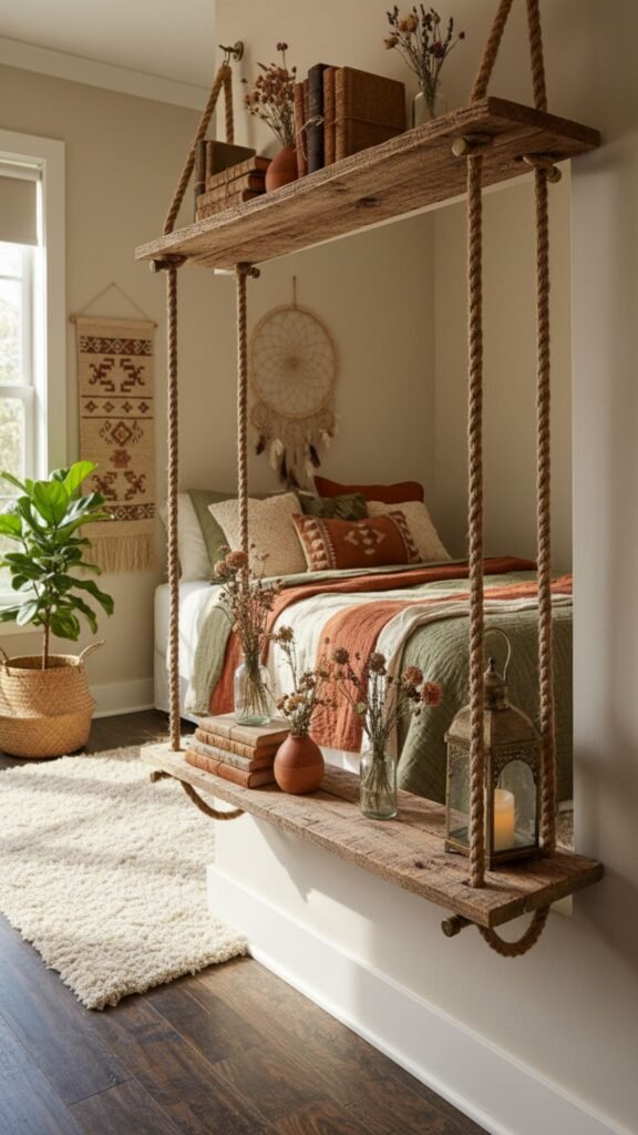 Reclaimed wood brings a rustic, well-traveled quality to your space. Combined with thick rope brackets, it creates a relaxed, natural aesthetic perfect for bohemian bedrooms.