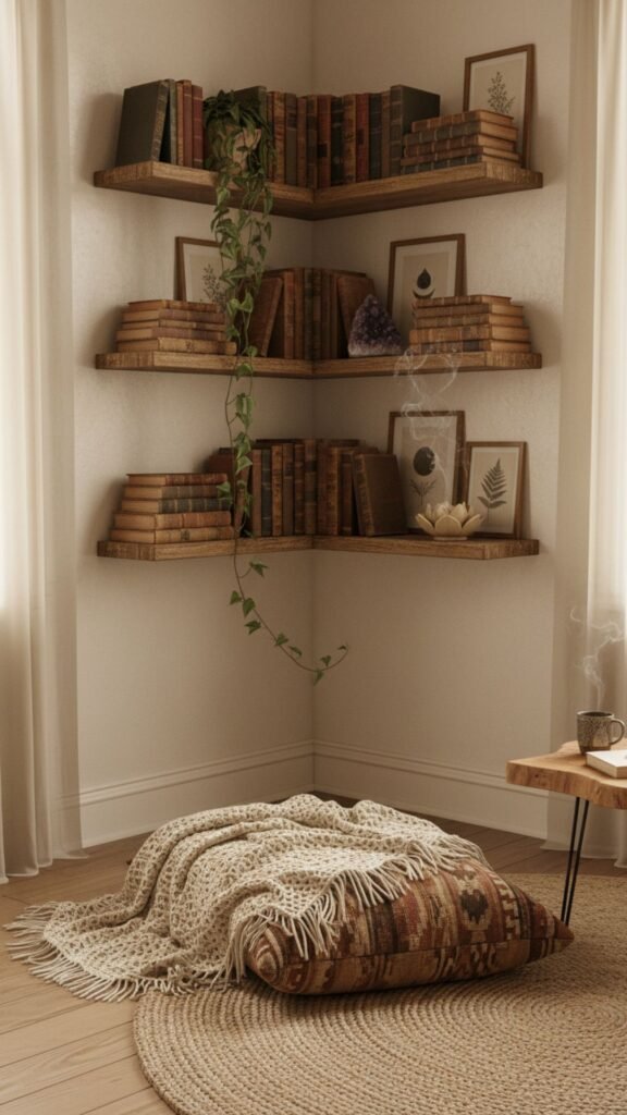 Corner shelves make use of often-overlooked wall space. They create a cozy, tucked-away display area that’s perfect for a bedside book nook or a little altar of favorite objects.