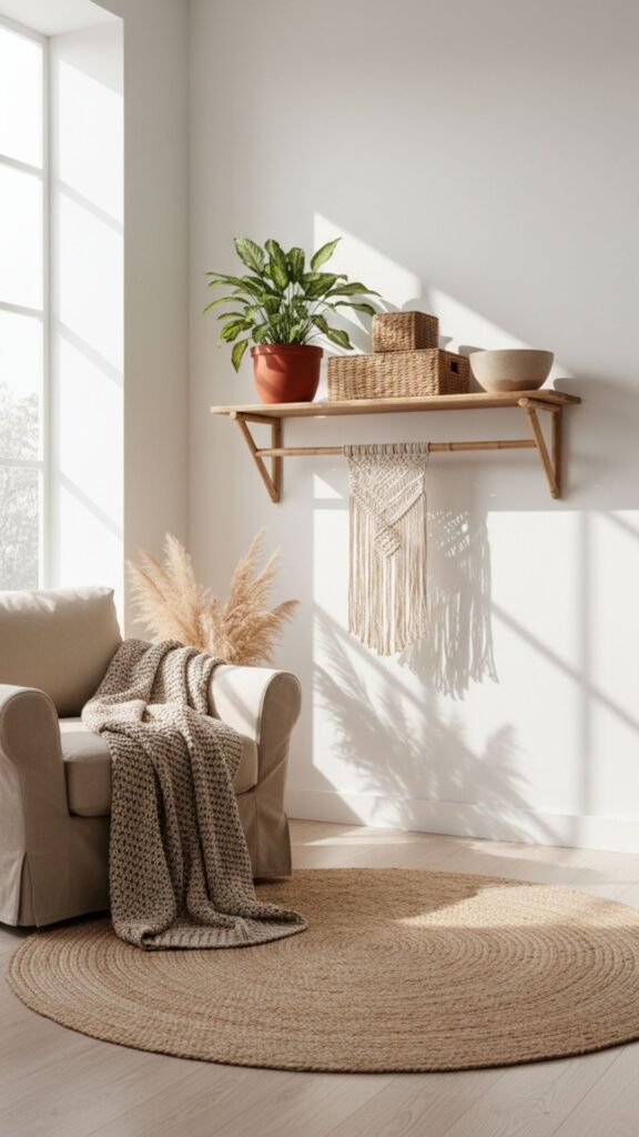 Few things scream boho louder than macramé. Draping a piece over or below a floating shelf adds softness and handcrafted charm to an otherwise plain wall.