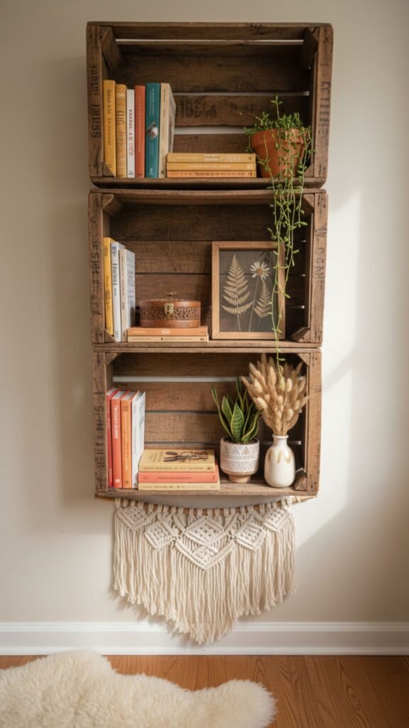 Old wooden crates mounted to the wall are a clever and budget-friendly way to create boho floating storage. They add depth, character, and a hint of nostalgia.