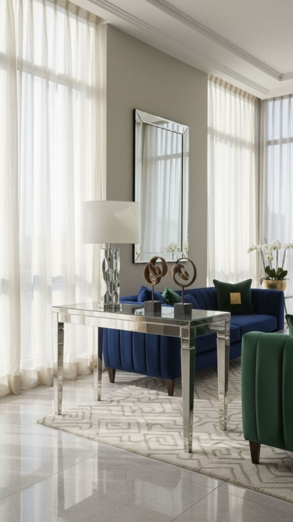 Mirrored finishes are a staple of glam decor because they amplify light and create an illusion of a larger space. A table lamp with a mirrored or reflective glass base adds a subtle but effective sparkle to side tables or credenzas. It blends seamlessly with any color palette while elevating the overall aesthetic.