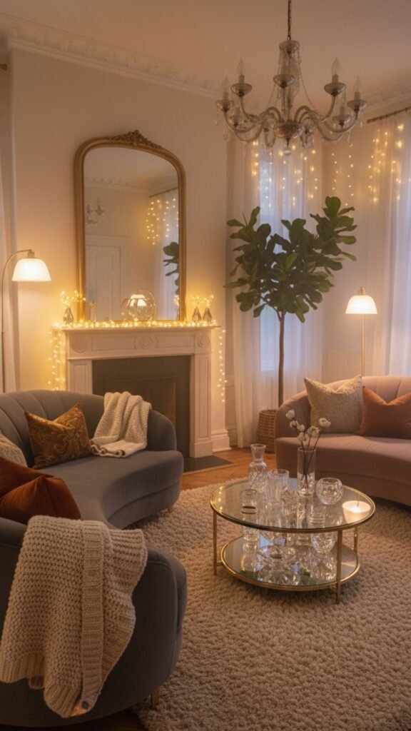 Fairy lights aren’t just for dorm rooms; when styled correctly, they add a whimsical, magical sparkle to a glam living room. Draping delicate, warm-white string lights inside a large glass cloche or around a grand mirror creates a cozy and inviting atmosphere.