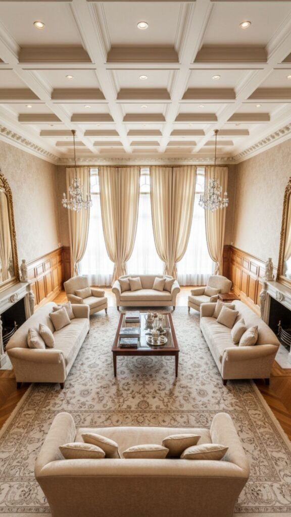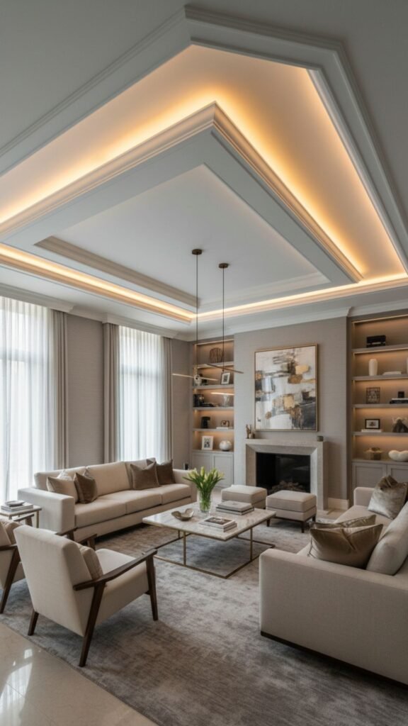 Coffered ceilings consist of a series of sunken panels, usually square or rectangular, covering the entire surface. This traditional design adds immense architectural volume and acoustic improvement. When rendered in POP, it delivers an ultra-luxurious, mansion-like quality to your living room.