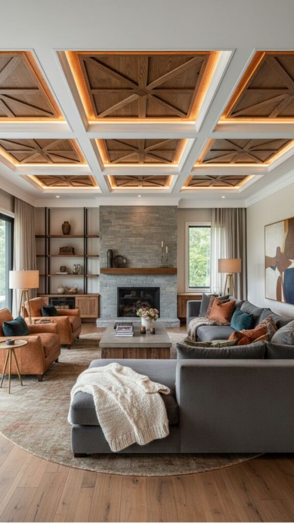A tray ceiling features a recessed center that creates a beautiful sense of depth and height. Adding hidden cove lighting around the inner perimeter casts a soft, warm glow across the room. This design is perfect for creating a cozy, sophisticated atmosphere without overwhelming your existing decor.