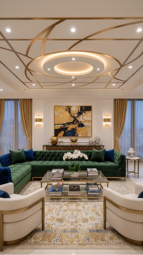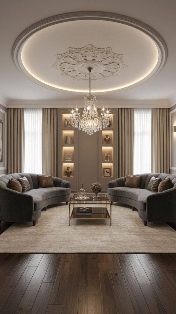 A circular POP drop or medallion creates a sweeping, elegant focal point, especially above a central seating area. It softens the hard corners of a standard square room and naturally draws attention to a statement lighting fixture.