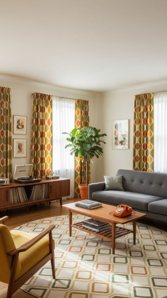 Geometric shapes were a hallmark of 1960s textile design. Curtains featuring repeating diamonds, hexagons, or overlapping circles immediately draw the eye and establish a vintage vibe. These patterns work exceptionally well when paired with minimalist teak furniture, adding necessary visual interest to the room.