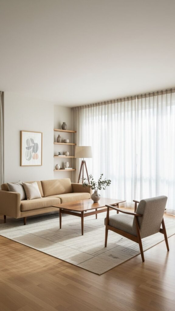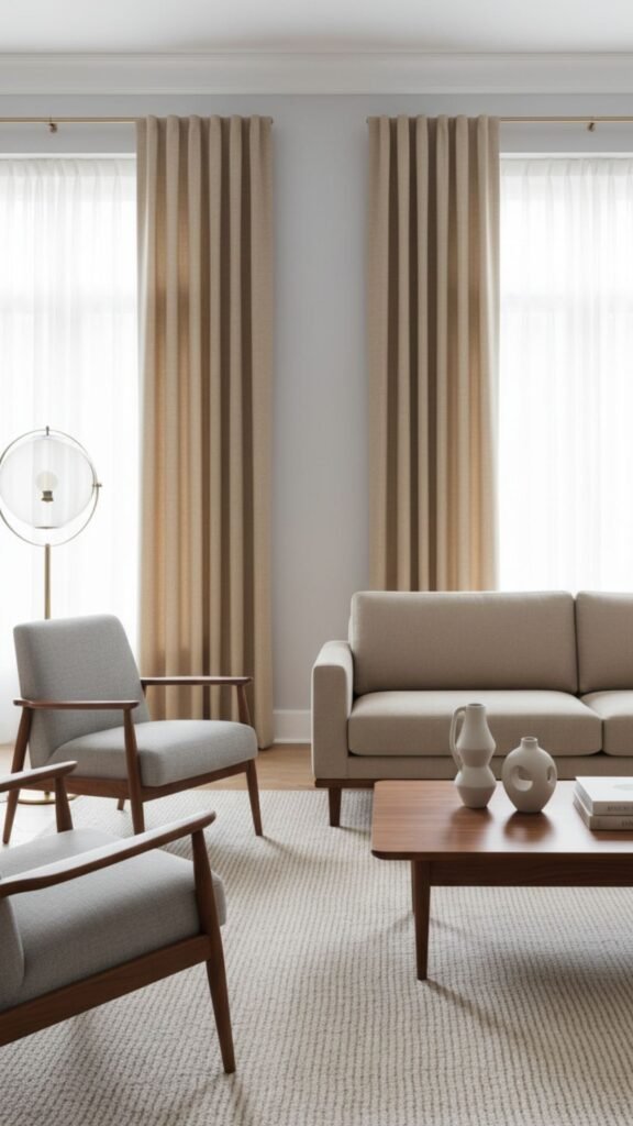 Sometimes, the best retro look is subtle and understated. Sheer linen panels allow natural light to flood the room, highlighting the clean lines of your mid-century furniture. This breezy, organic texture aligns perfectly with the era’s focus on connecting indoor and outdoor spaces.