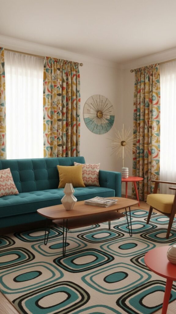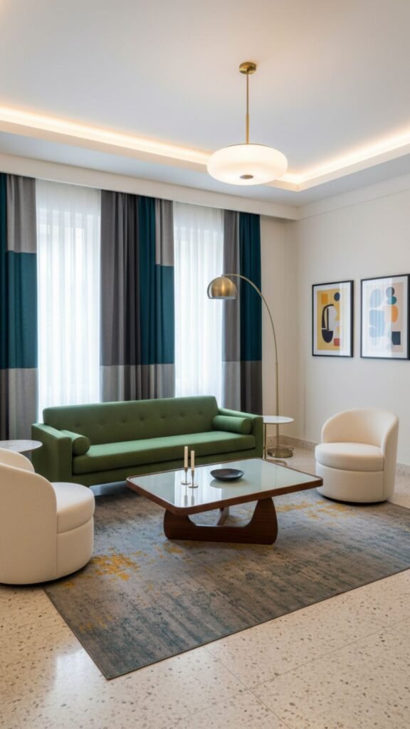 Color blocking is a dynamic way to introduce retro flair. Curtains featuring large, horizontal or vertical bands of contrasting colors create a striking architectural element in the room. It is a bold choice that perfectly captures the adventurous spirit of mid-century modernism.