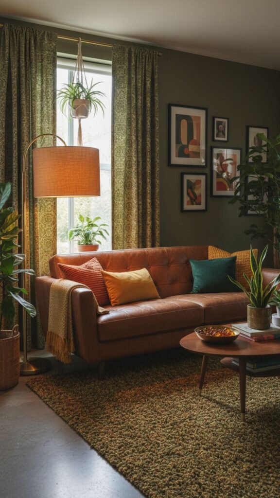 The 1970s transition of mid-century design introduced deep, earthy tones inspired by nature. Olive green curtains offer a moody, sophisticated backdrop that pairs beautifully with the era’s popular leather upholstery and vibrant indoor house plants.