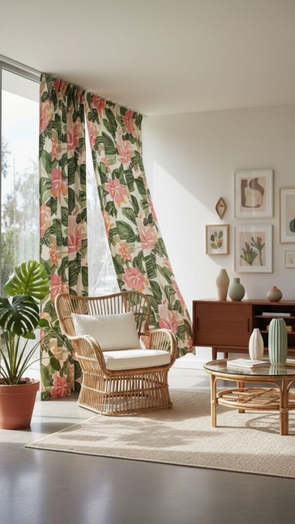 Barkcloth is a dense, textured cotton fabric heavily used in the 1950s. Tropical prints featuring large palm leaves, hibiscus flowers, and bamboo motifs were incredibly popular in post-war American homes. These curtains instantly create a relaxed, Palm Springs-inspired atmosphere.