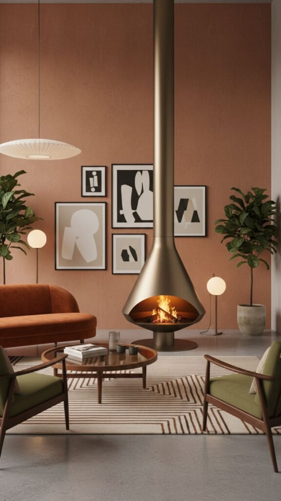 Nothing screams retro quite like a conical, freestanding metal fireplace. These iconic structures, often associated with the Malm brand, add a highly sculptural element to the room while taking up minimal floor space. They serve as both a functional heating source and a striking piece of art.