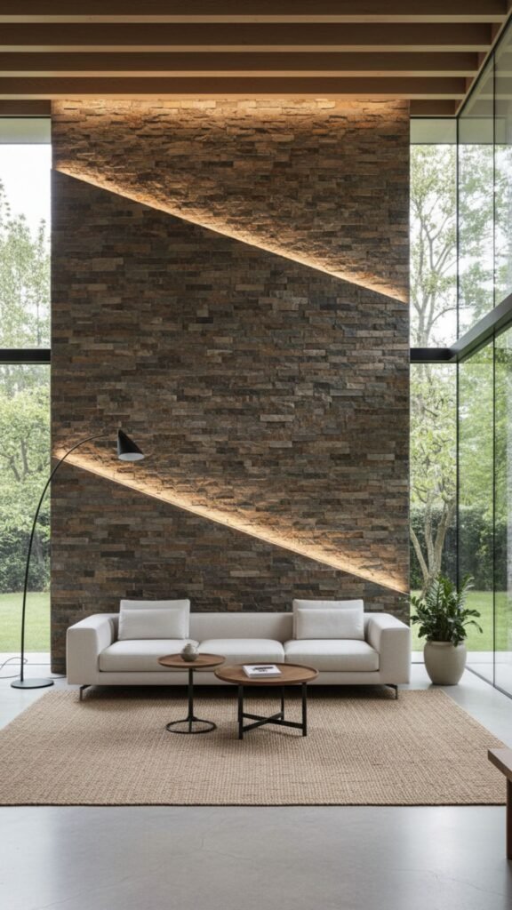Mid-century modern architecture frequently played with asymmetry to create visual interest. An asymmetrical stacked stone veneer fireplace brings an organic, textured feel to the living room, bridging the gap between the indoors and the natural world outside.